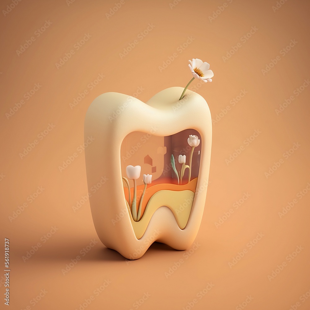 Quadro em tela 3d Illustartion, healthy tooth with flowers