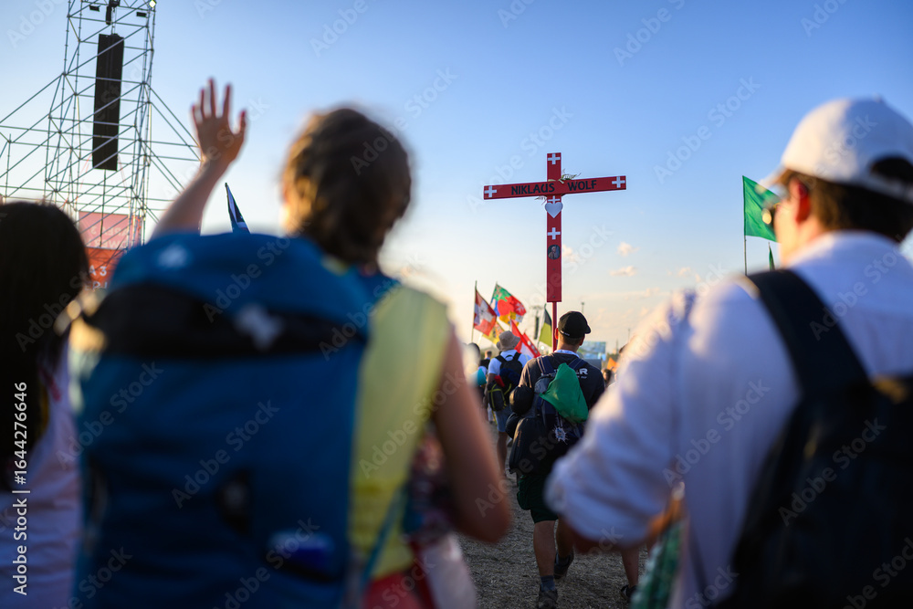 Fotografia A girl walking past and greeting groups of young people at the Tor Vergata camp during the Youth Jubilee with Pope Leo XIV