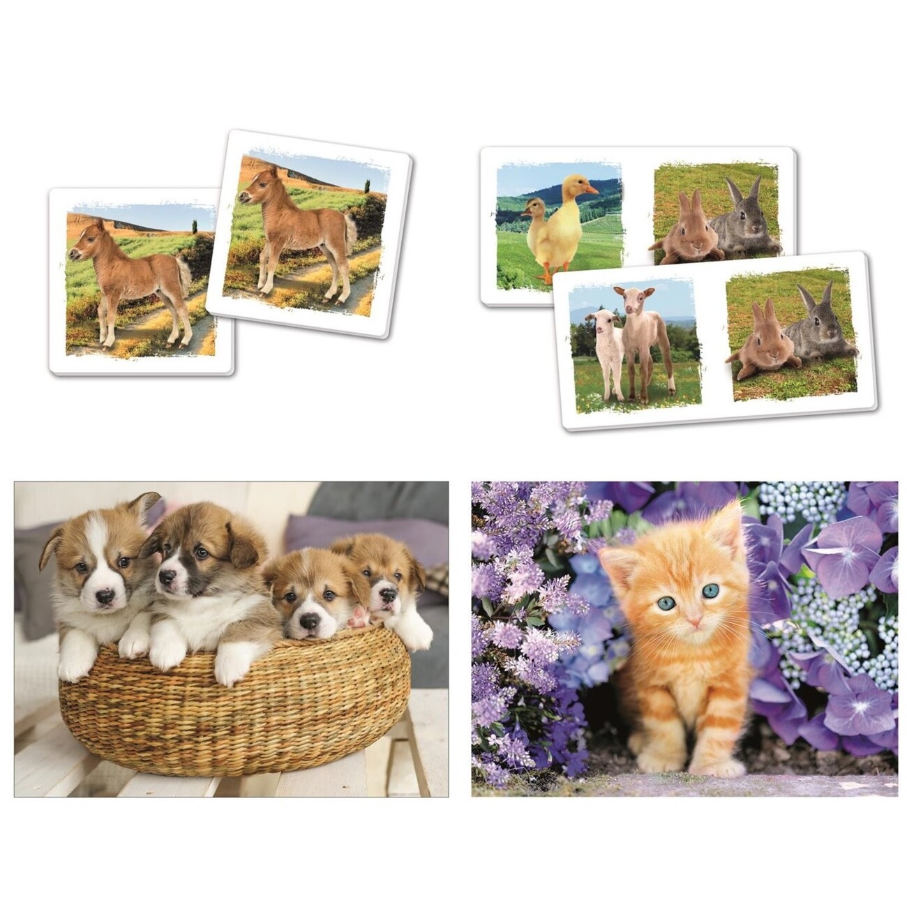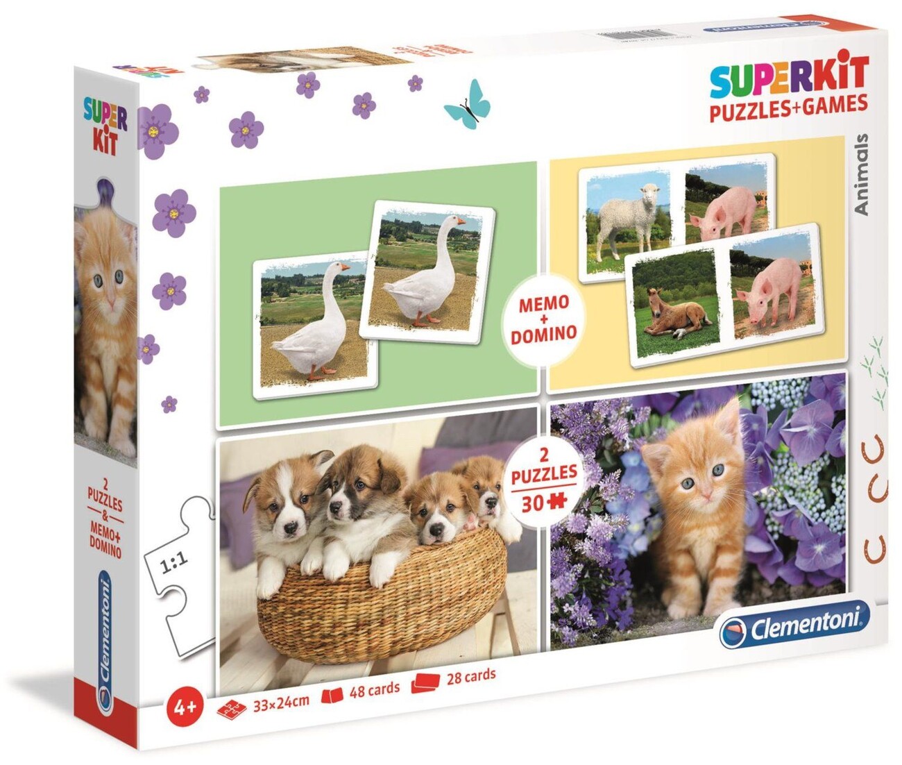 Uma caixa, três jogos: dois puzzles infantis (30 peças cada), dominó e jogo da memória – com cenas da vida na quinta. Diversão partilhada e variada que desenvolve motricidade fina e atenção; as peças são fáceis de segurar e encaixam suavemente. Os puzzles Clementoni destacam-se pela impressão nítida, corte preciso e encaixe perfeito. Embalado numa caixa robusta e elegante.