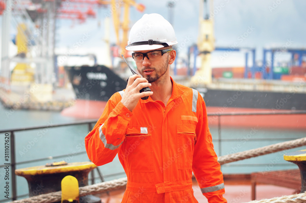 Autocolante An experienced sailor in orange overalls and a white helmet works on a bulk carrier
