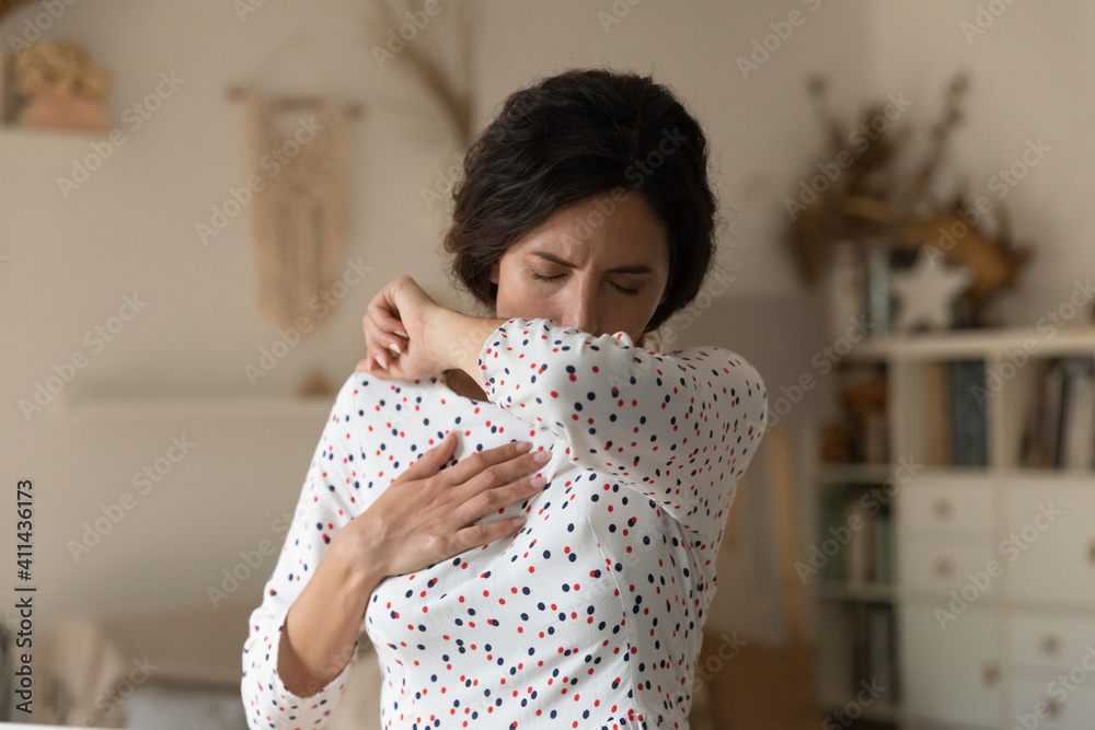 Autocolante Unhealthy millennial Caucasian woman feel sick cough in elbow suffer from cold or influenza