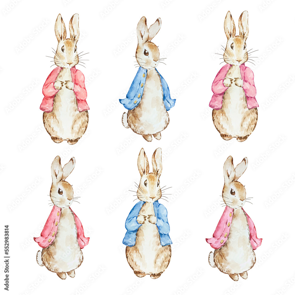 Autocolante Set of Watercolor cute Peter Rabbits in red and blue jacket