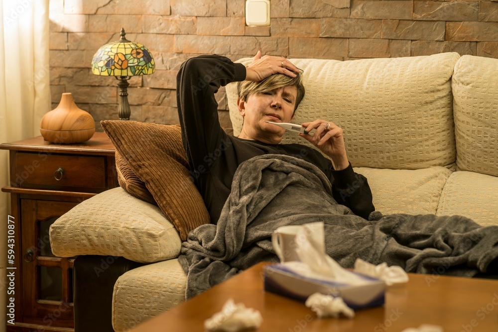 Autocolante Woman looking at the thermometer with a concerned look on her face