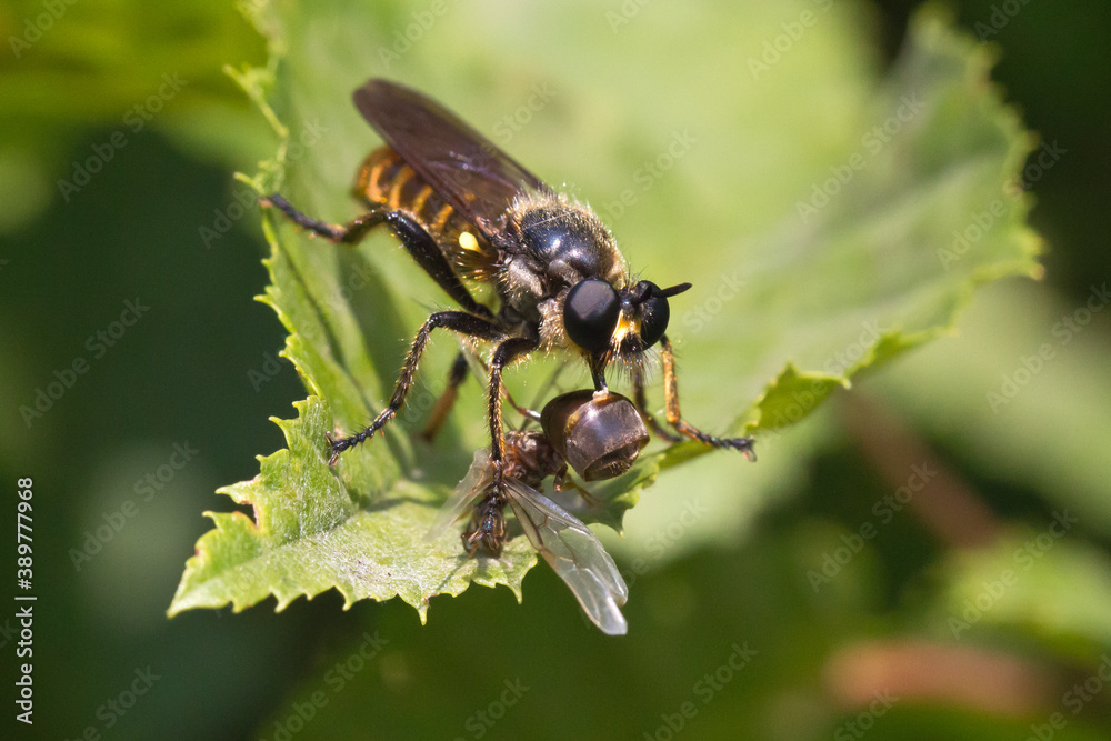 Quadro em tela Closeup of a fly devouring its prey on a leaf