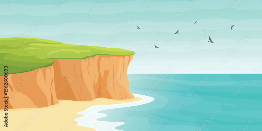 Quadro em tela Coastal Cliff Landscape with Sea View Vector Illustration.