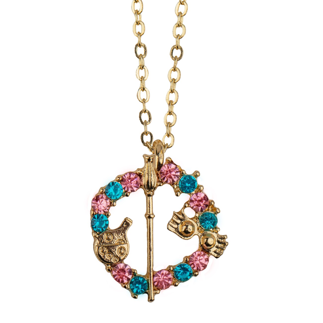 Um colar encantador inspirado em Luna Lovegood, perfeito para fãs que não têm medo de mostrar a sua originalidade. O pendente é em liga de zinco e decorado com uma pedra de strass (2,3 × 2,3 × 0,1 cm), preso a uma corrente de ferro de 45 cm ajustável até 51 cm.