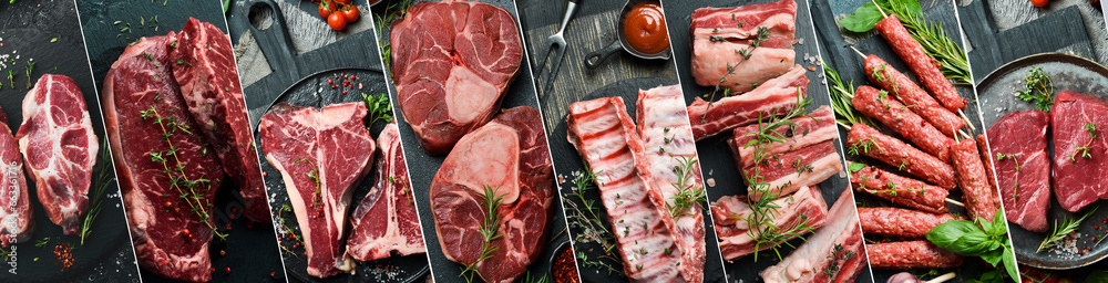 Fotografia Collage of different assortment of veal meat, pork, steaks, kebabs and sausages