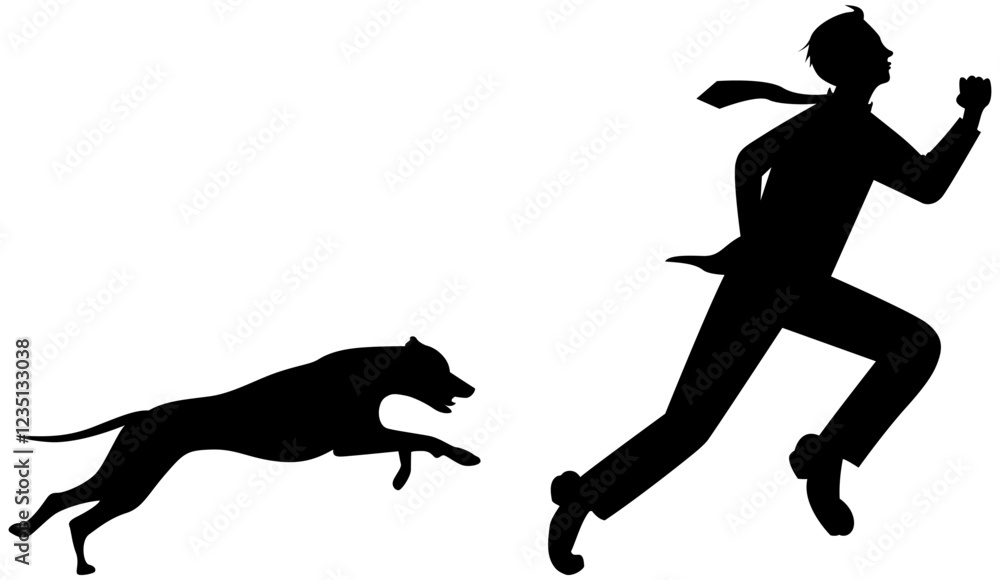 Fotografia man running away from dog in single color black, vector