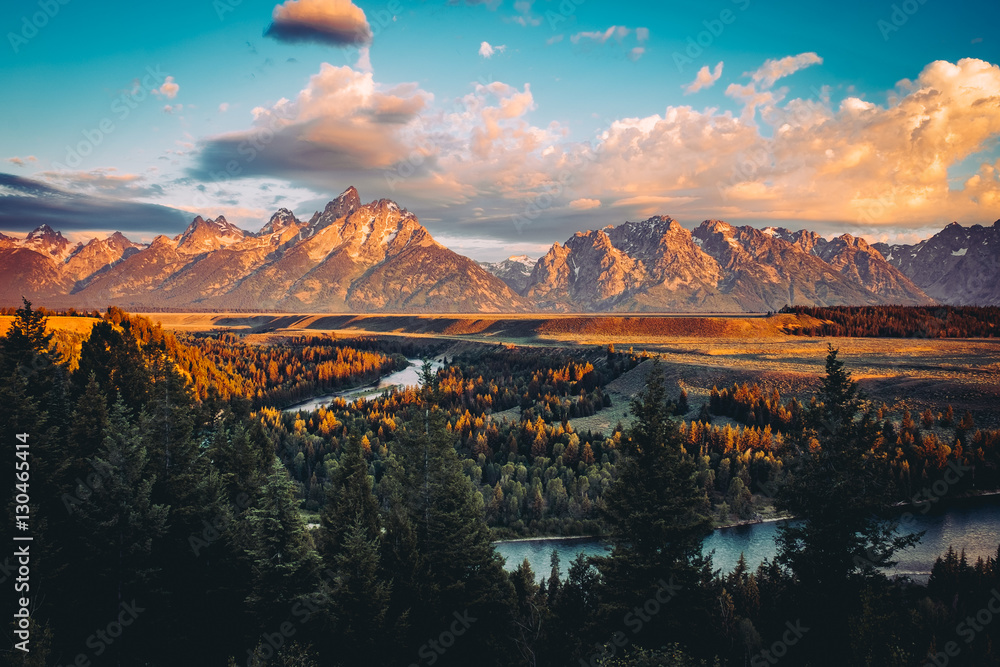 Fotografia Grand Tetons peak at sunrise with snake river overlook in Wyoming, US