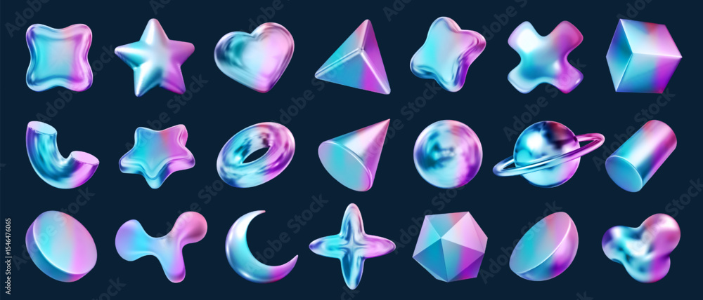 Fotografia 3d holographic shapes, geometric gradient object and vector y2k liquid icon with iridescent rainbow light and shiny metal texture