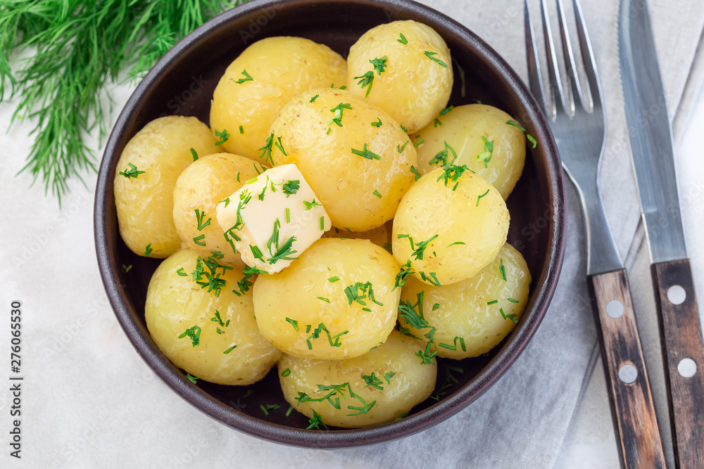 Fotografia New young boiled potato topped with melted butter and chopped dill in ceramic b
