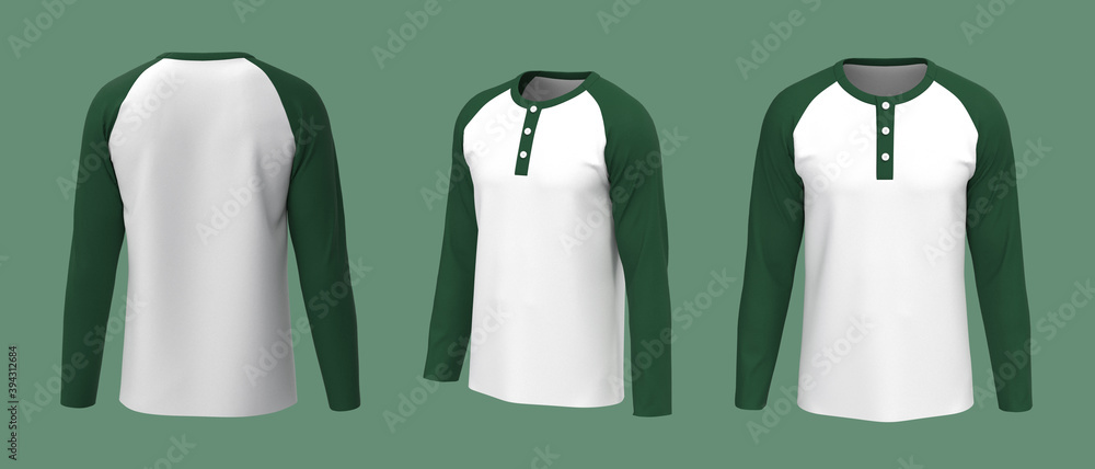 Fotografia Blank raglan henley t-shirt with long sleeve mockup, front, side and back views,