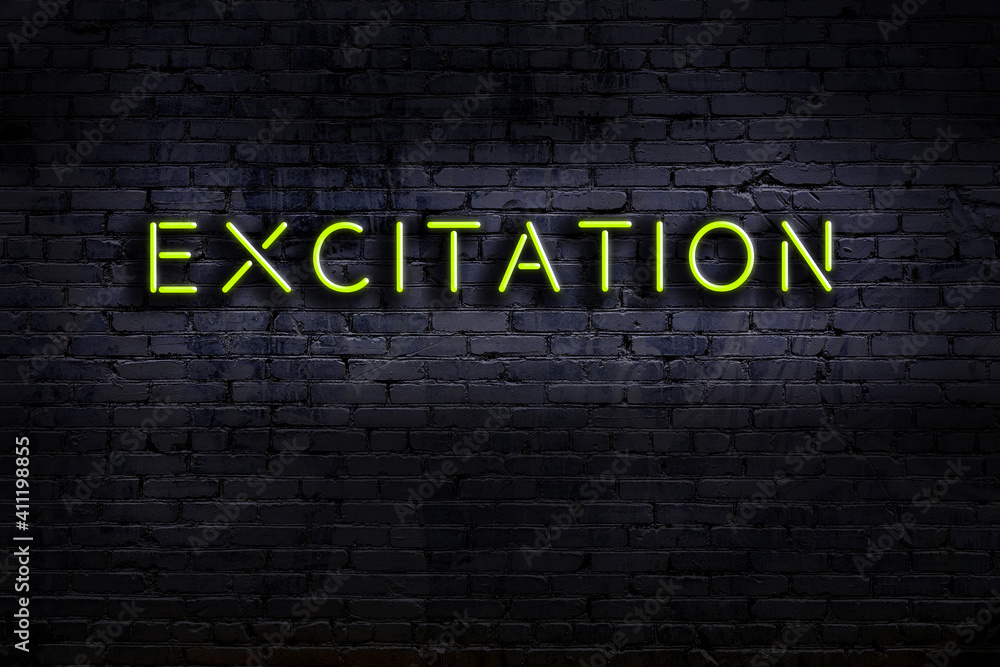 Fotografia Neon sign. Word excitation against brick wall. Night view