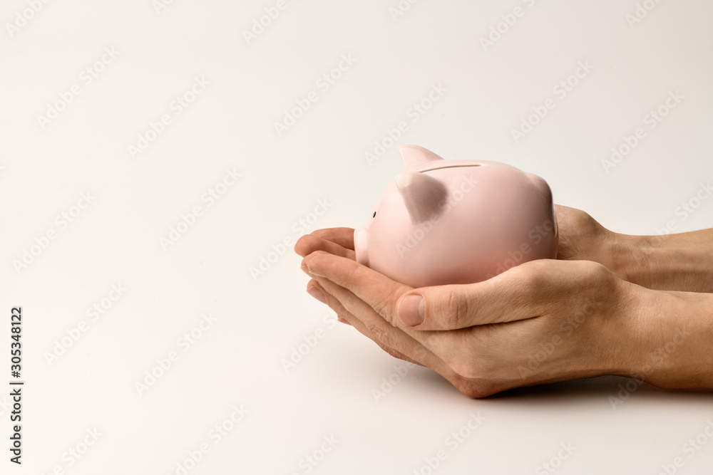Fotografia In men's hands lies a pink piggy Bank on a gray background