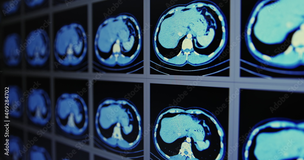 Quadro em tela Many computed tomography scans in motion of lower and middle abdominal area