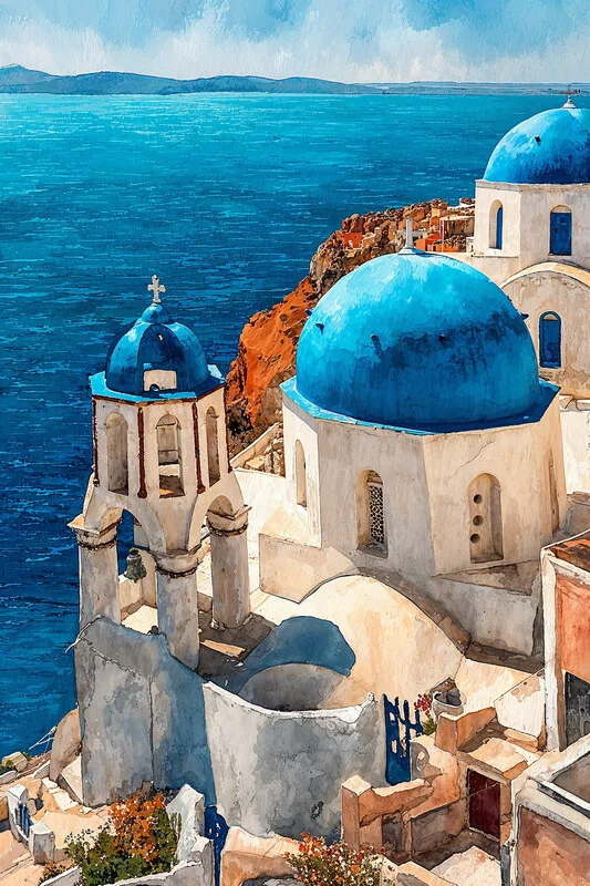 Poster Santorini Serenity – Blue Domes Above the Aegean