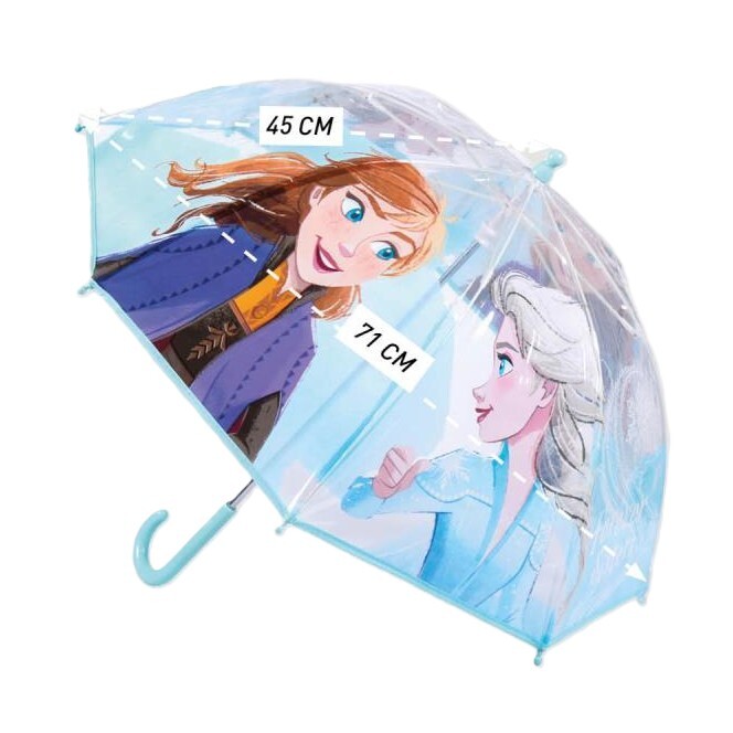 Guarda-chuva infantil transparente tipo bengala com tema Frozen. Estrutura em fibra de vidro com 8 varetas, abertura manual segura e fácil e pega curva leve para mãos pequenas. Ideal para o jardim-de-infância e o caminho para a escola.
