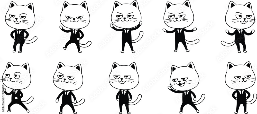 Fotografia Minimalist 2D cat stickman icons with ten confident playful poses in clean black