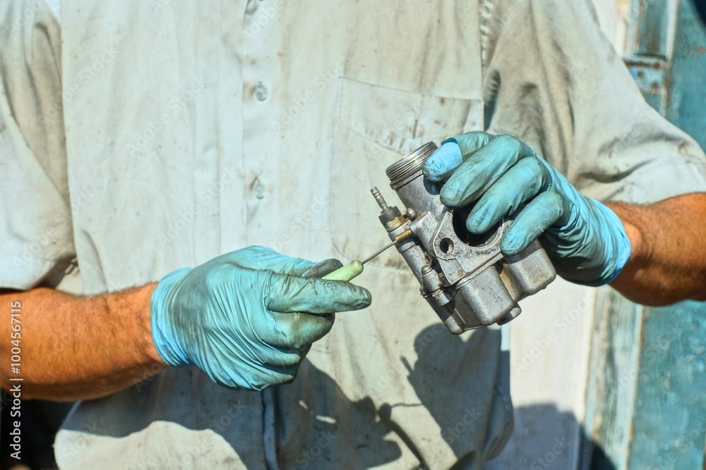 Murais de parede worker with hands in blue rubber gloves cleans with a sharp iron awl a green pla