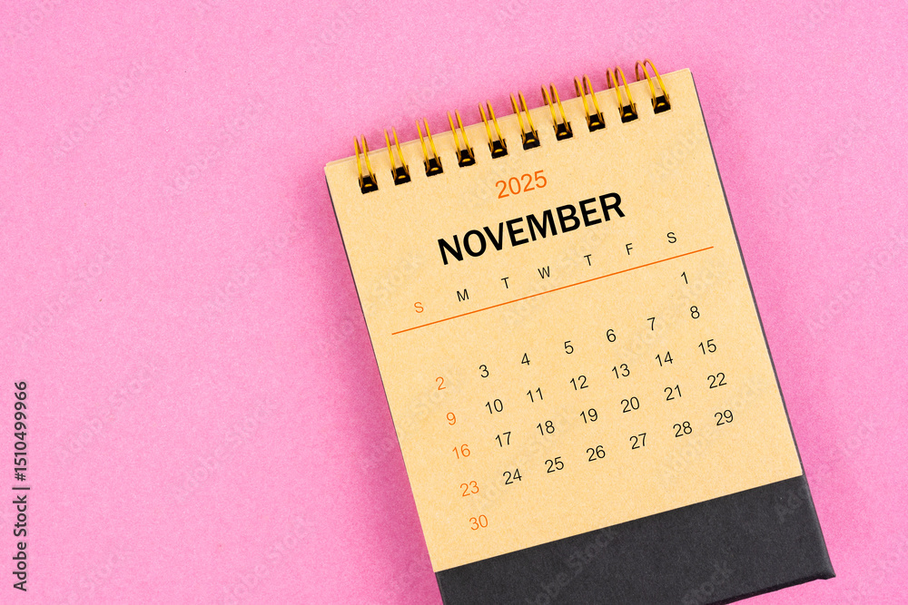 Murais de parede Brown desk calendar for November 2025 on pink background.