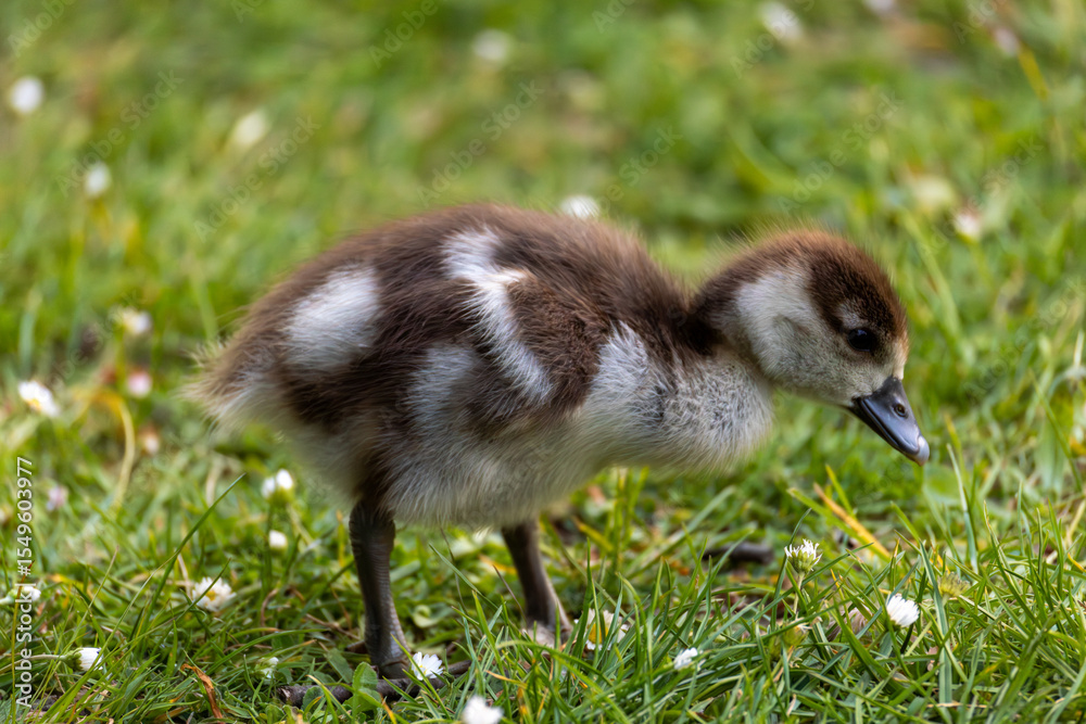 Murais de parede A fluffy brown and white baby duckling walks on vibrant green grass in a natural setting