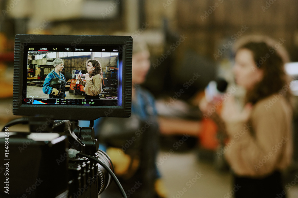 Murais de parede Caucasian middle aged woman and Caucasian young adult woman standing in industri
