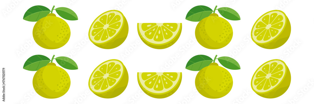 Murais de parede Lime assortment pattern, whole fruits with leaves, halves and wedges, repeating