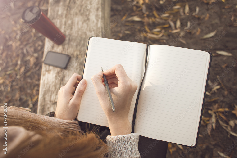 Murais de parede Girl write to the note in the autumn park