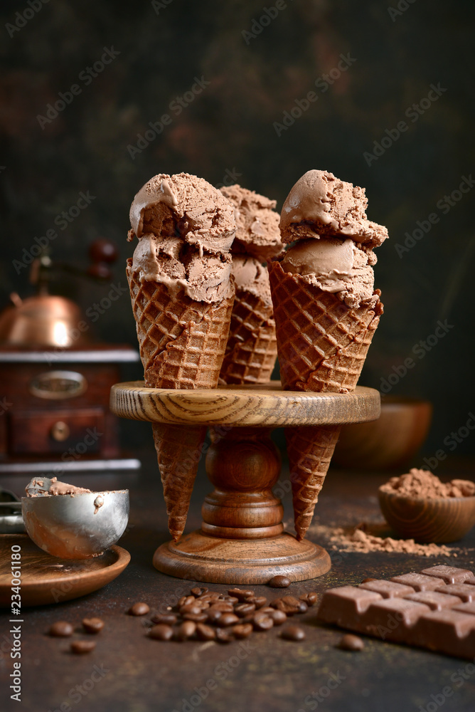Murais de parede Chocolate coffee ice cream in a waffle cone.