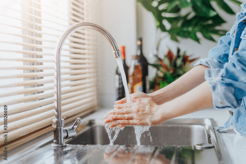 Murais de parede Woman washing hands in sink before cooking in kitchen