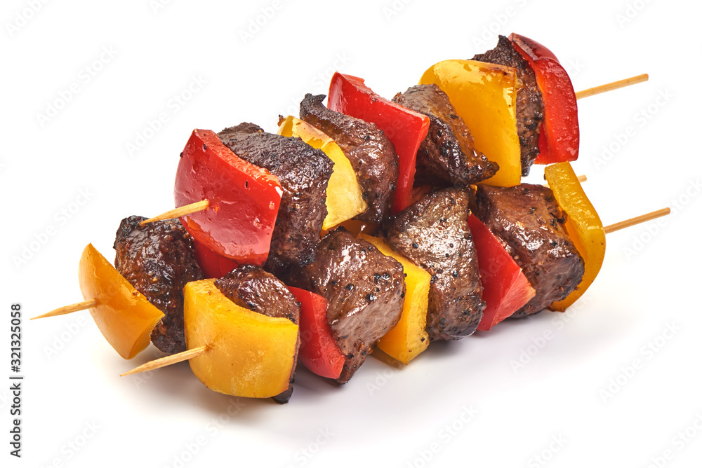 Murais de parede Roasted mutton skewers, BBQ kebab, isolated on white background