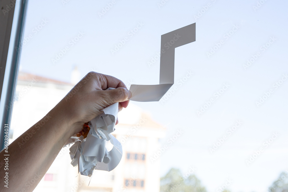 Murais de parede Close up of a Woman hand removing a vinyl sticker from a window with a tool