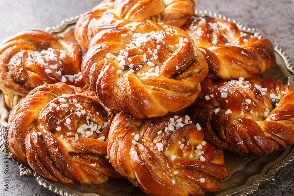 Murais de parede Swedish cinnamon rolls kanelbullar topped with pearl sugar close-up on a plate on the table