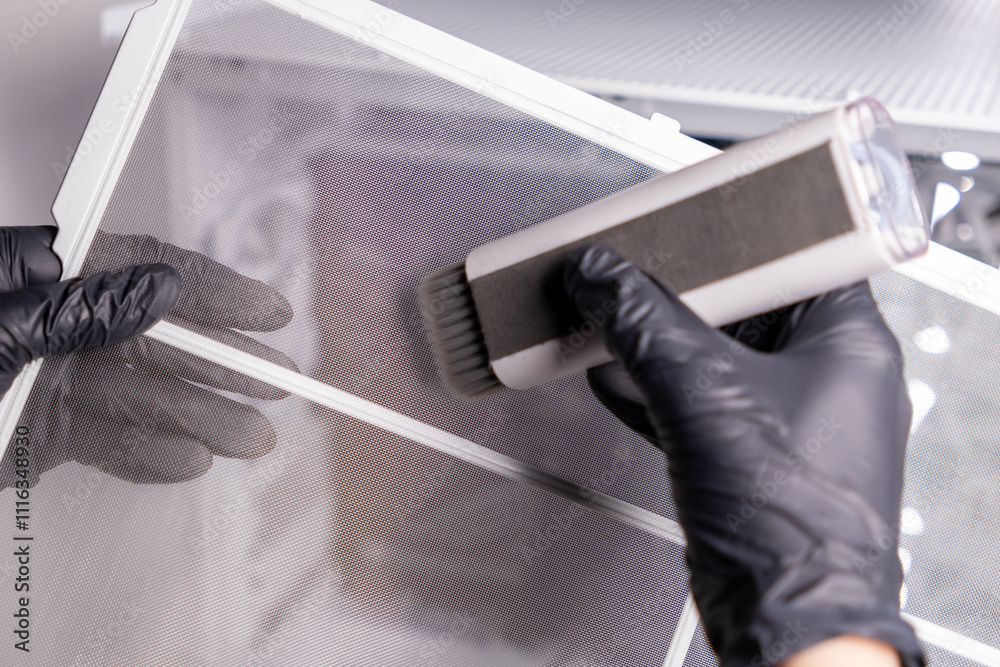 Quadro em tela brushing pc case filter, gloves, cleaning dust, hand holding brush, filter maint