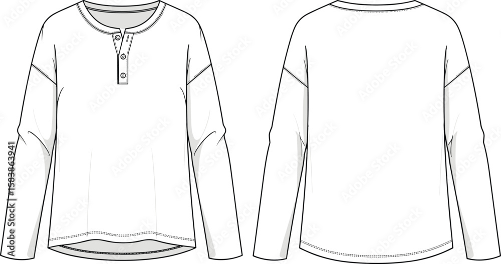 Quadro em tela Long sleeve casual henley shirt design, flat sketch fashion illustration, vector