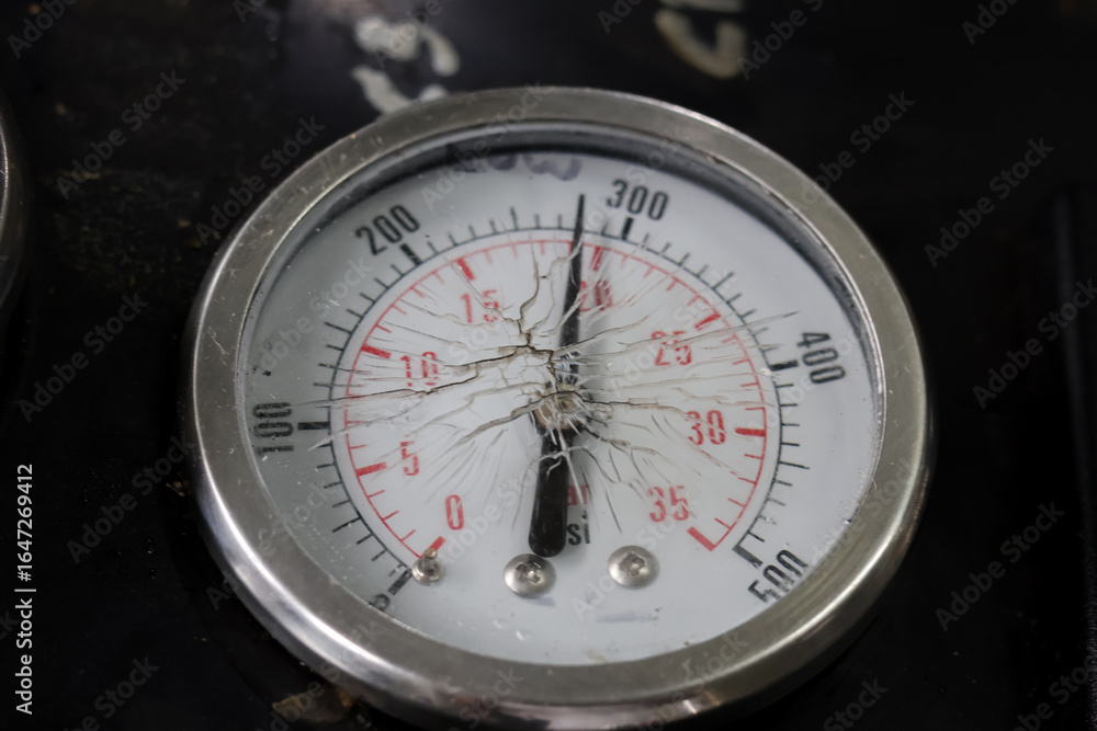 Quadro em tela Pressure gauge or manometer with broken glass caused by high pressure, showing 300 PSI