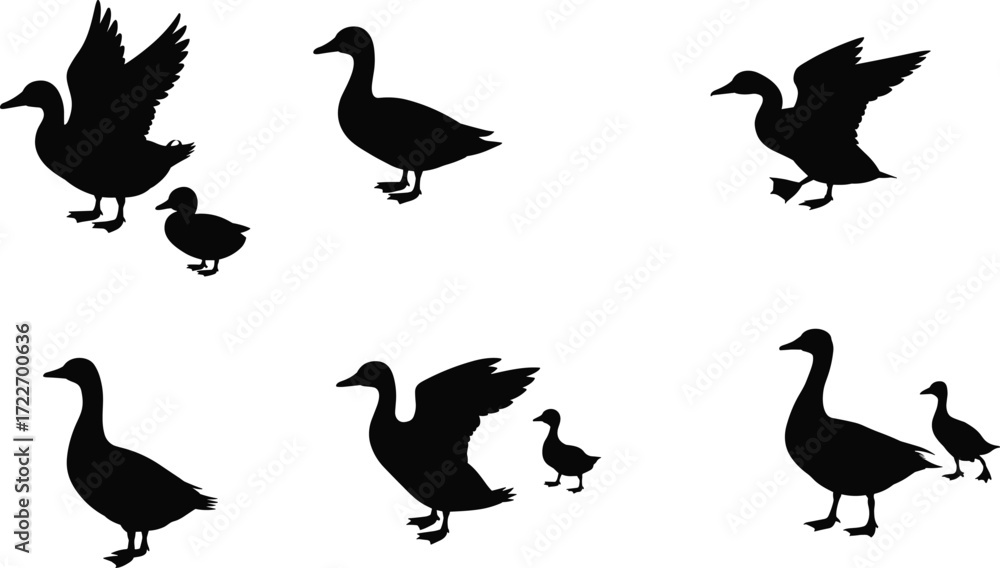 Quadro em tela Duck and gosling silhouettes, bird family, wildlife illustration, parent and bab