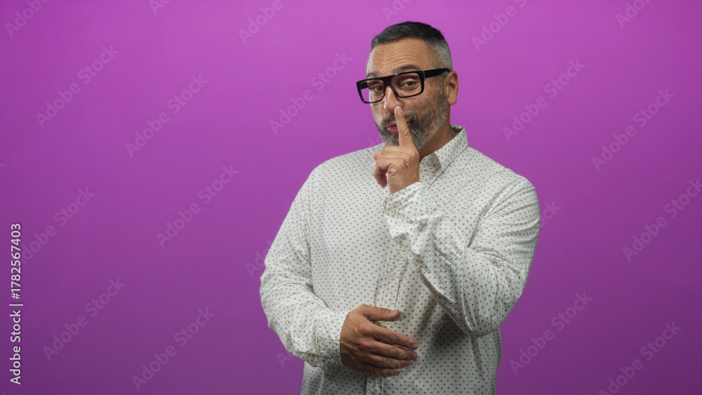 Quadro em tela Man wearing glasses pointing finger with clasped hands in purple studio set; confidence witty charm