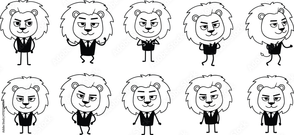 Quadro em tela Ten minimalist stickman-style lion icons wearing a sleek black suit accessory, c