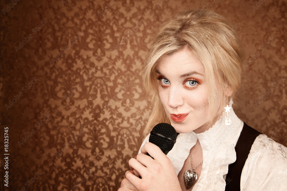 Quadro em tela Pretty young singer or comedian with microphone