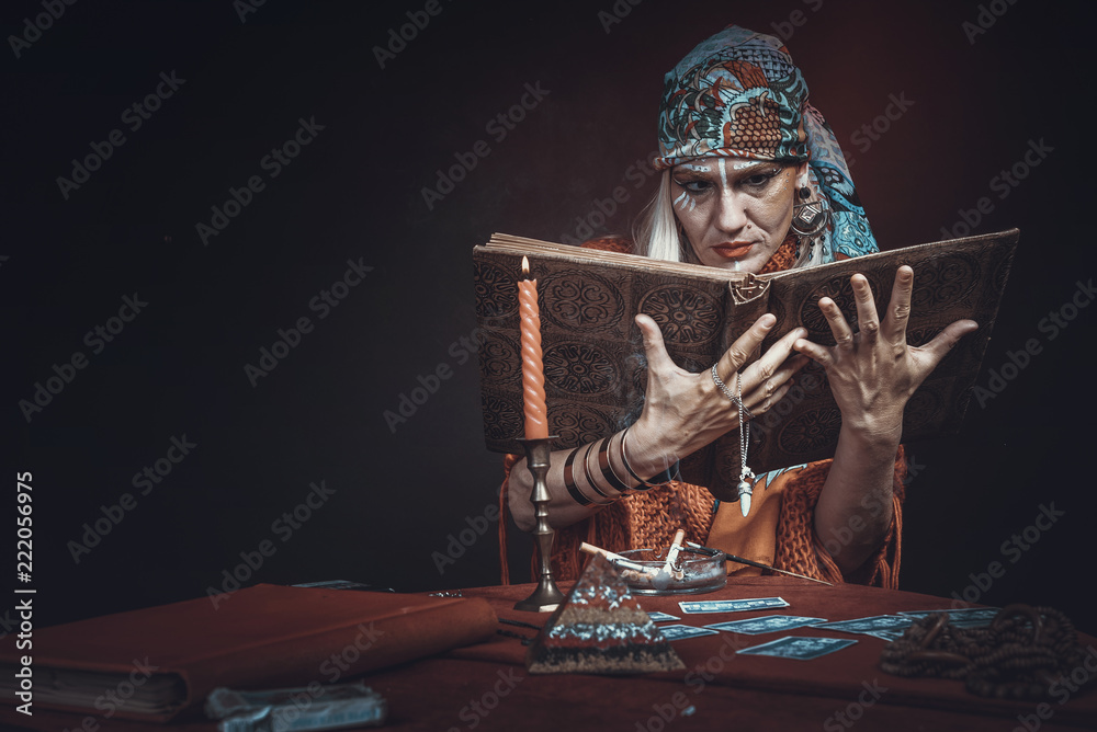 Quadro em tela Folklore gypsy tribal soothsayer, chanting spell from her spellbook