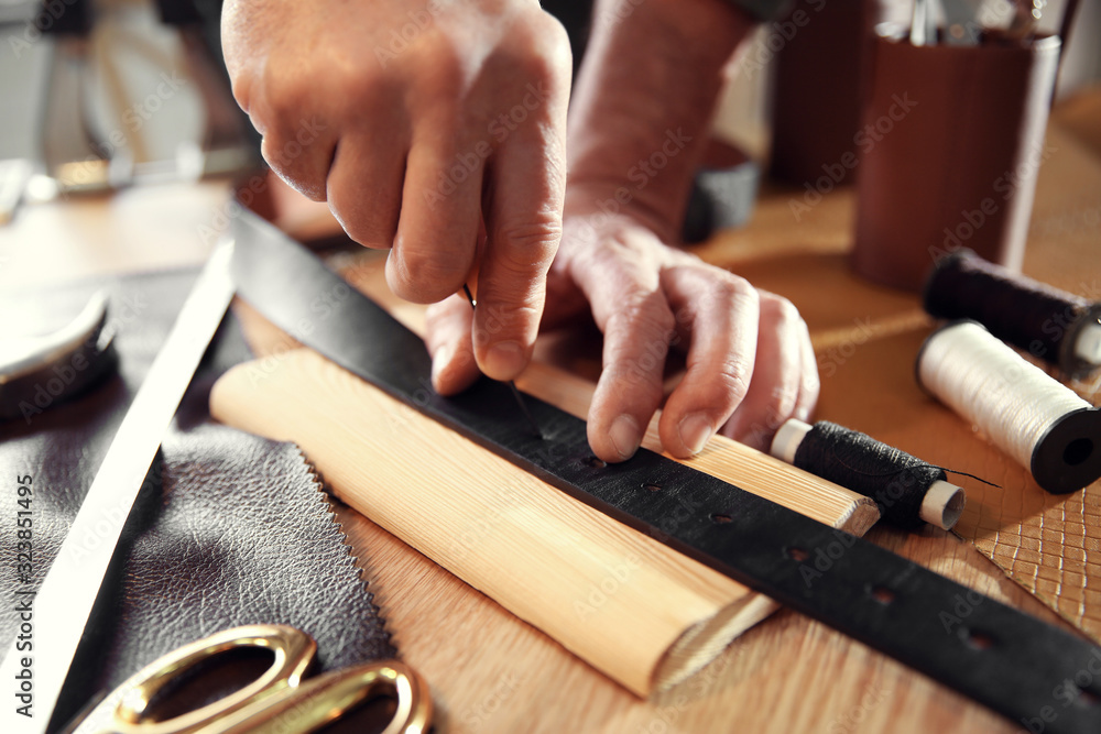Quadro em tela Man making holes in leather belt with stitching awl at table, closeup