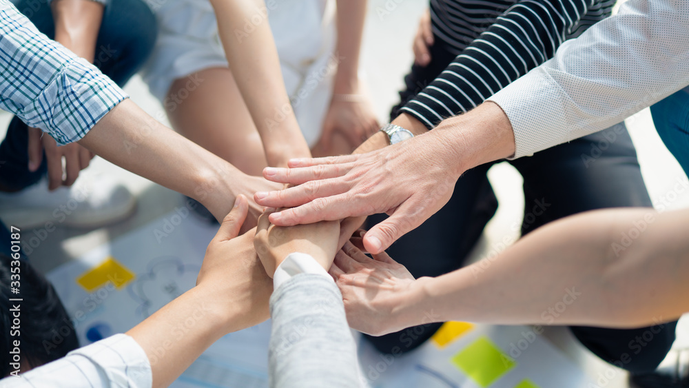 Quadro em tela Background of business people bare hands stack join together in the middle with natural sunlight, Concept power of social network charity or volunteer to be unity help and support community