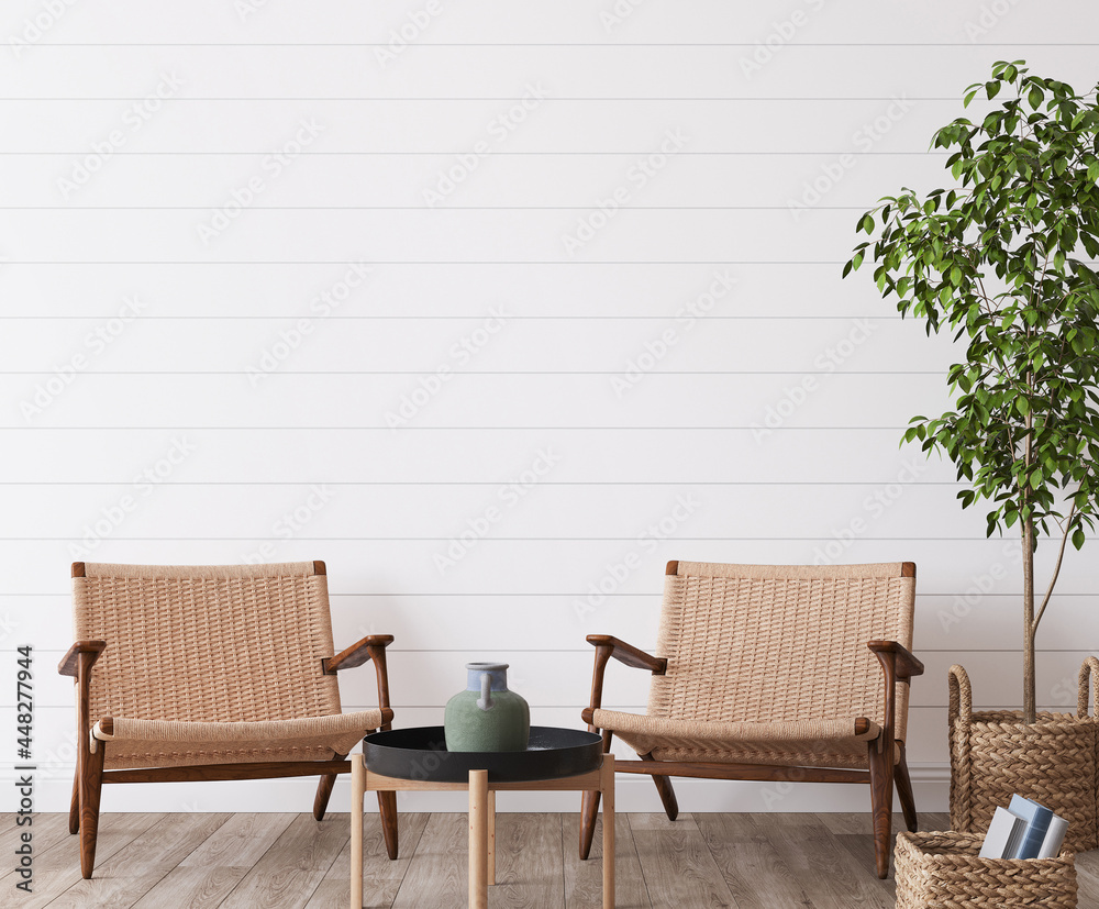 Quadro em tela white wall mockup in white coastal home design, 3d render