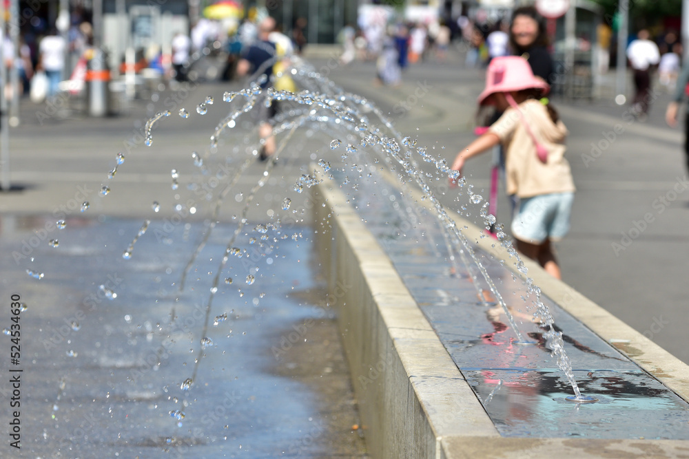 Quadro em tela Ein Mädchen kühlt sich an einem Wasserspiel in Wien (Bezirk Favoriten) ab