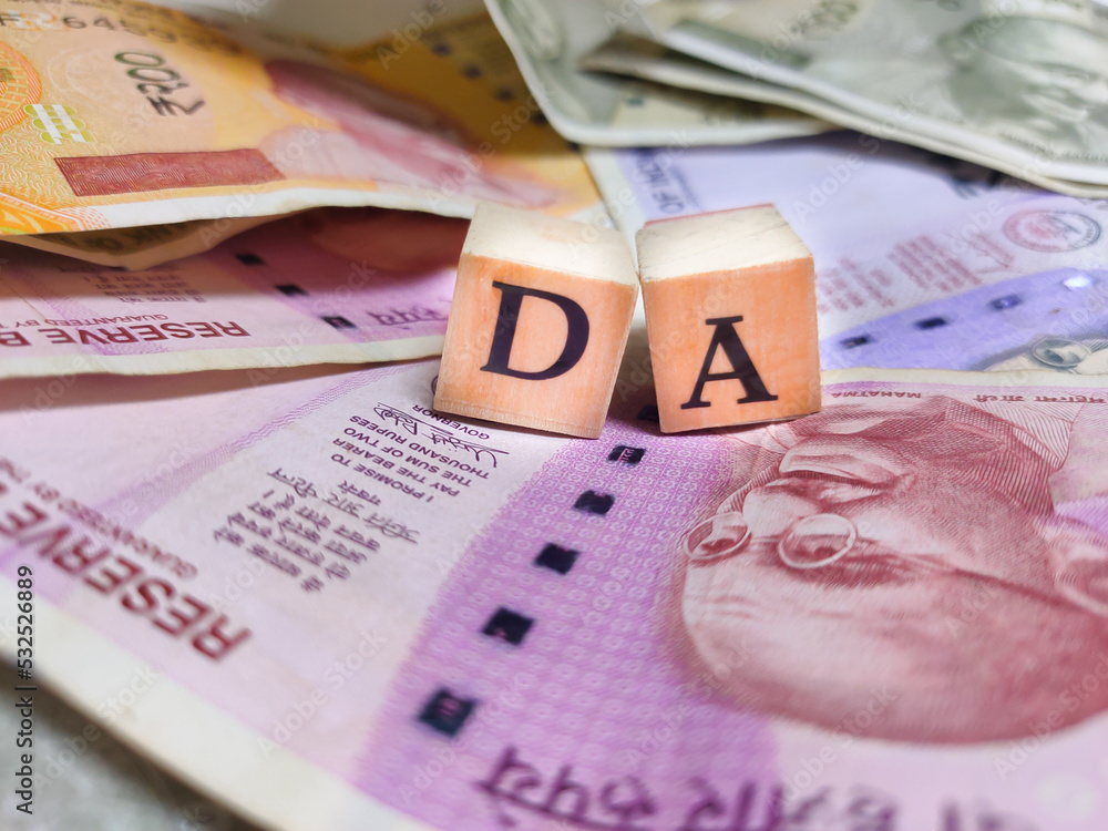 Quadro em tela Concept of DA or Dearness allowance with wooden bids or blocks on indian rupees notes