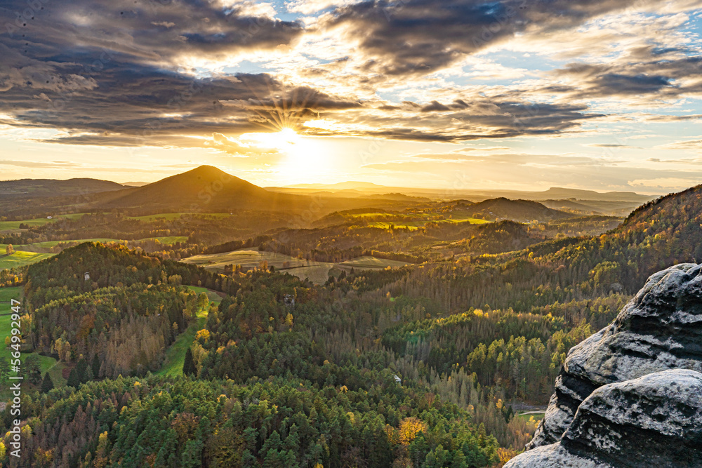 Quadro em tela Sunset and foggy sunrise at the glass viewpoint in Jetřichovice.