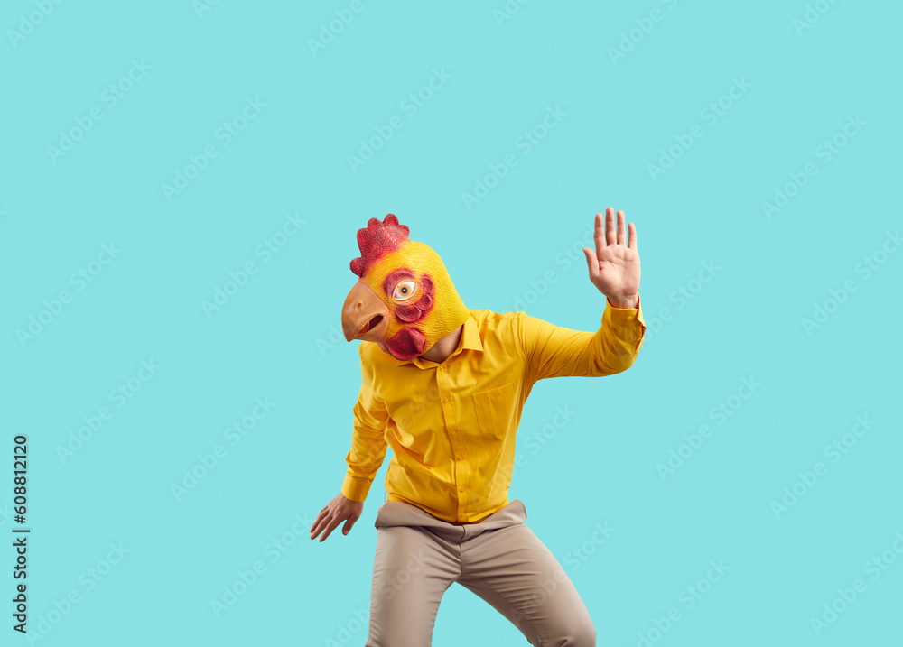 Quadro em tela Happy guy in yellow chicken mask having fun at crazy party