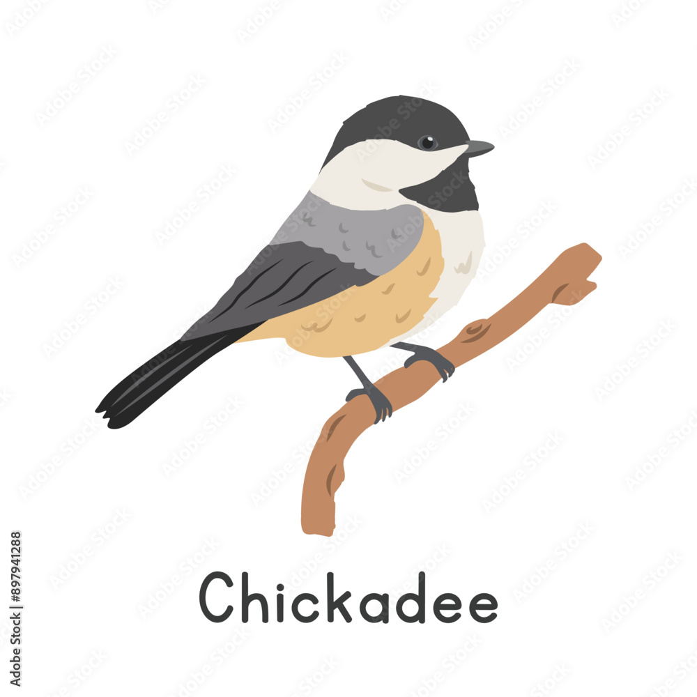 Quadro em tela Black-capped chickadee perched on tree branch vector illustration, cartoon clipart character, animal in flat style
