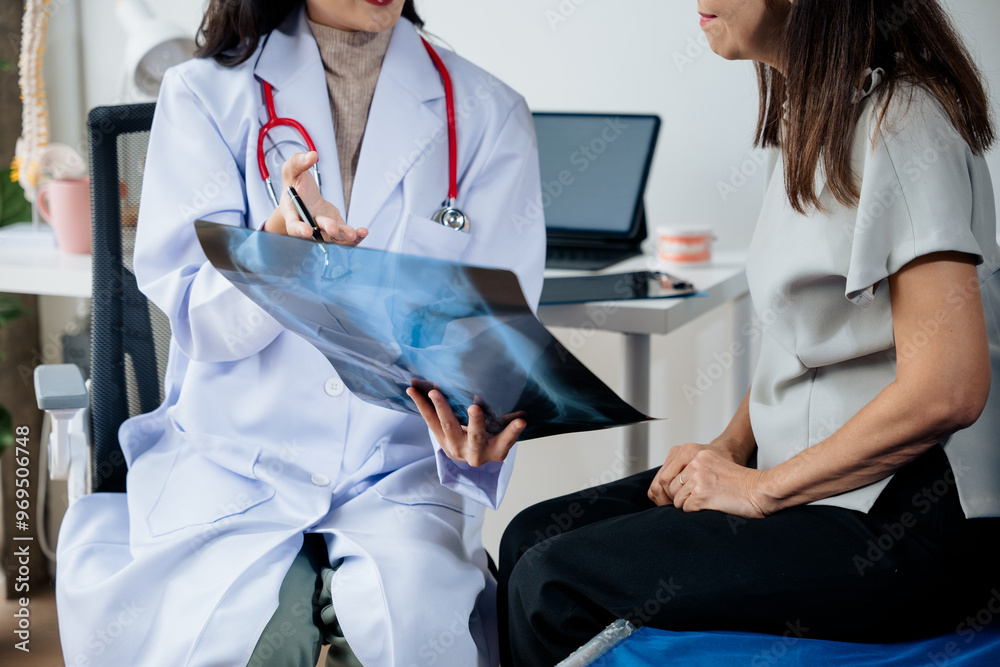 Quadro em tela The doctor explain the old lady in retired life patient on lungs x-ray film and